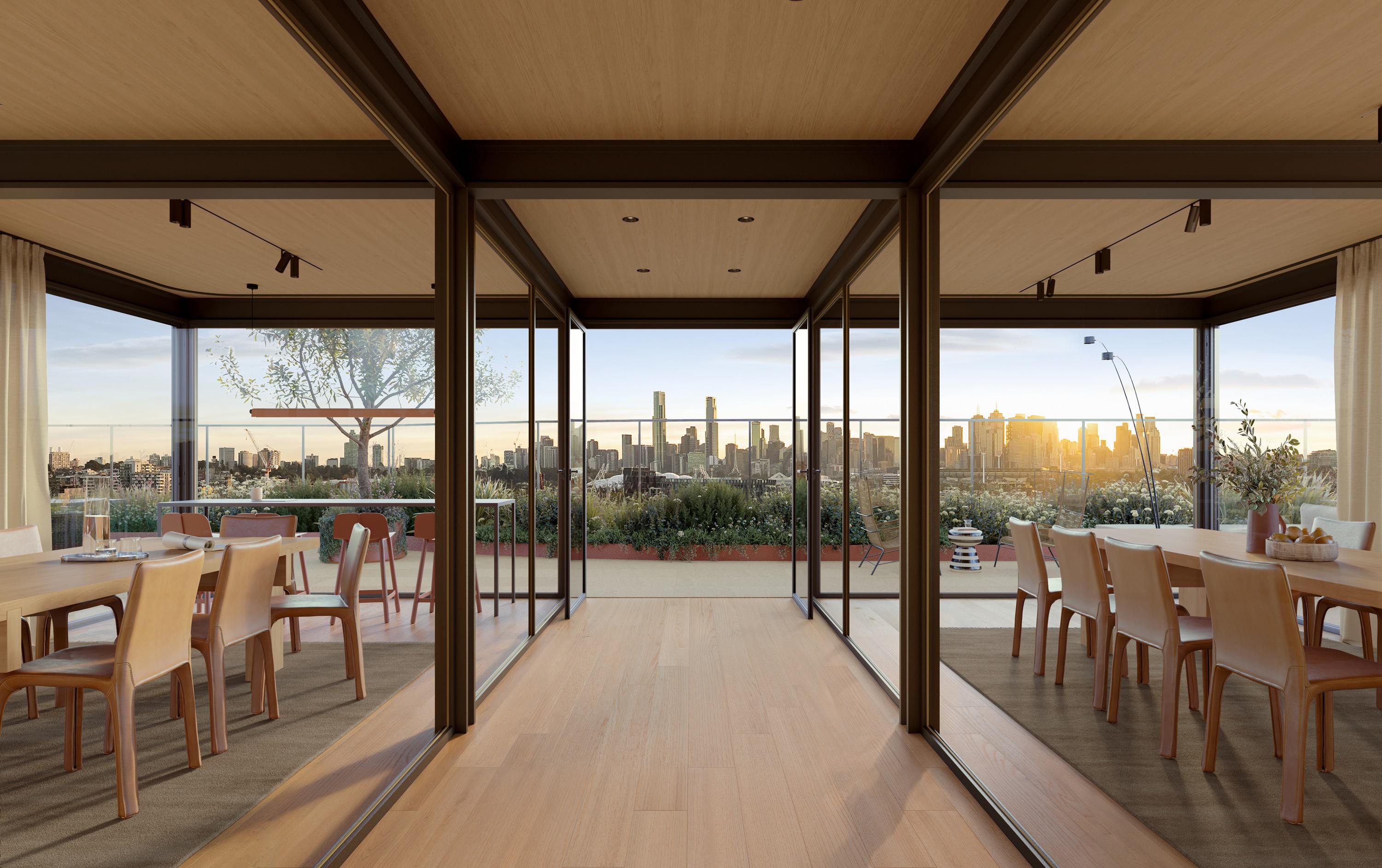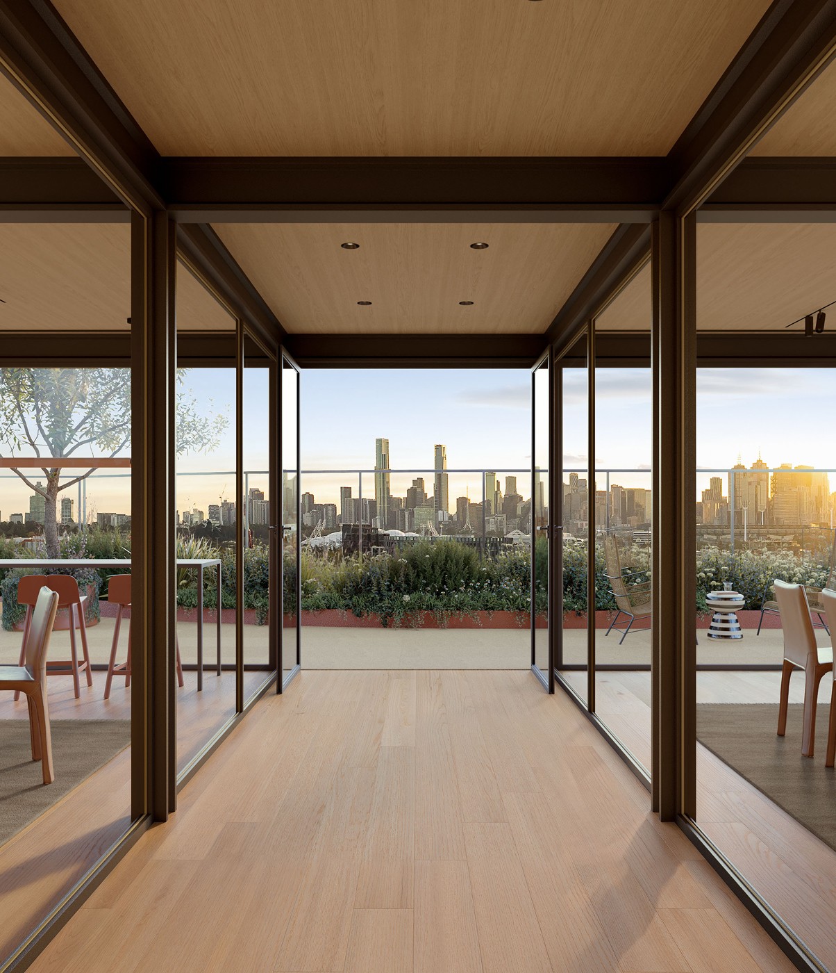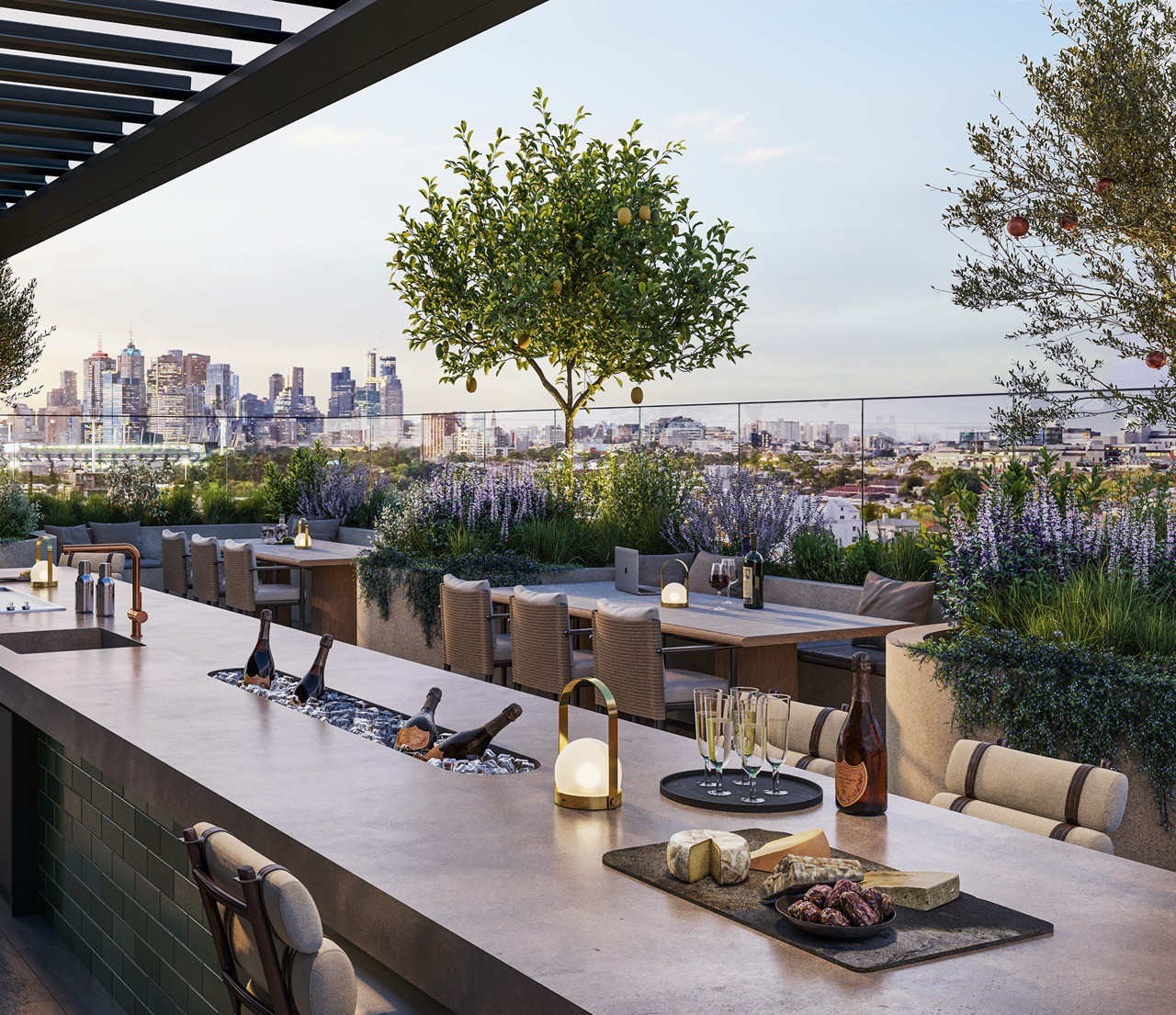 Above, resident-only rooftop sanctuaries curated by Acre crown each building, offering private dining rooms and elevated entertaining spaces set against panoramic views of Melbourne’s skyline. Designed for intimate dinners, discreet gatherings or moments of calm, these lush retreats strike a rare balance between exclusivity and connection.