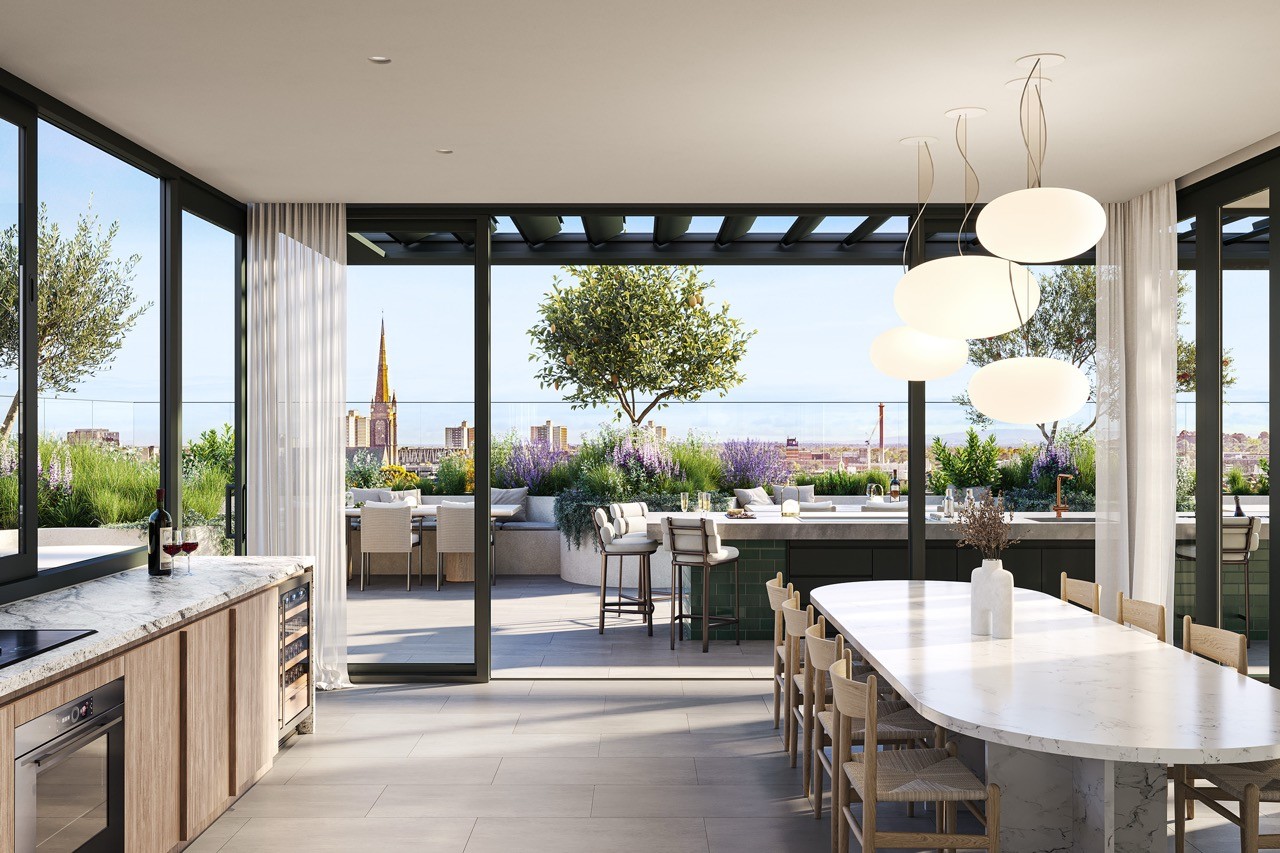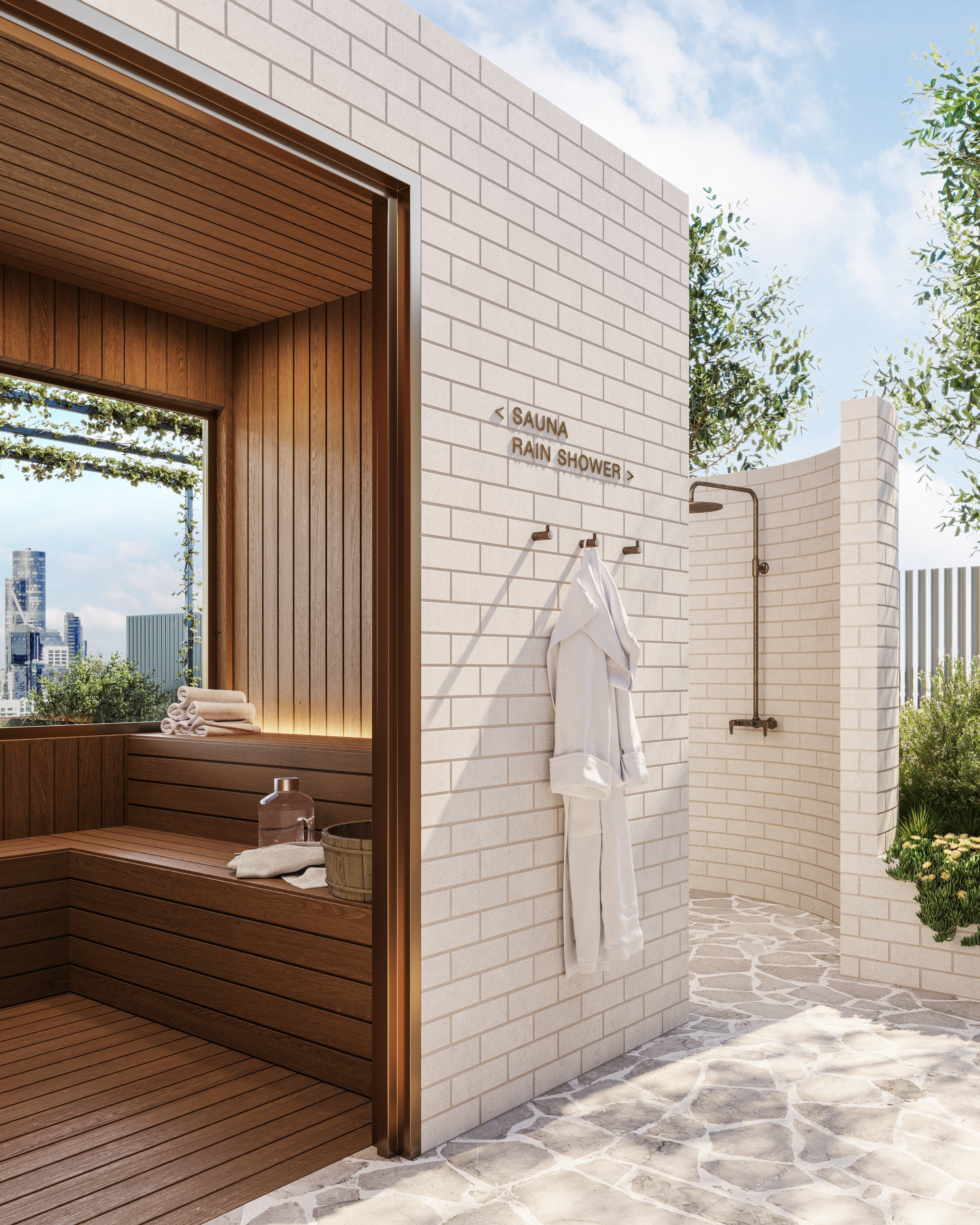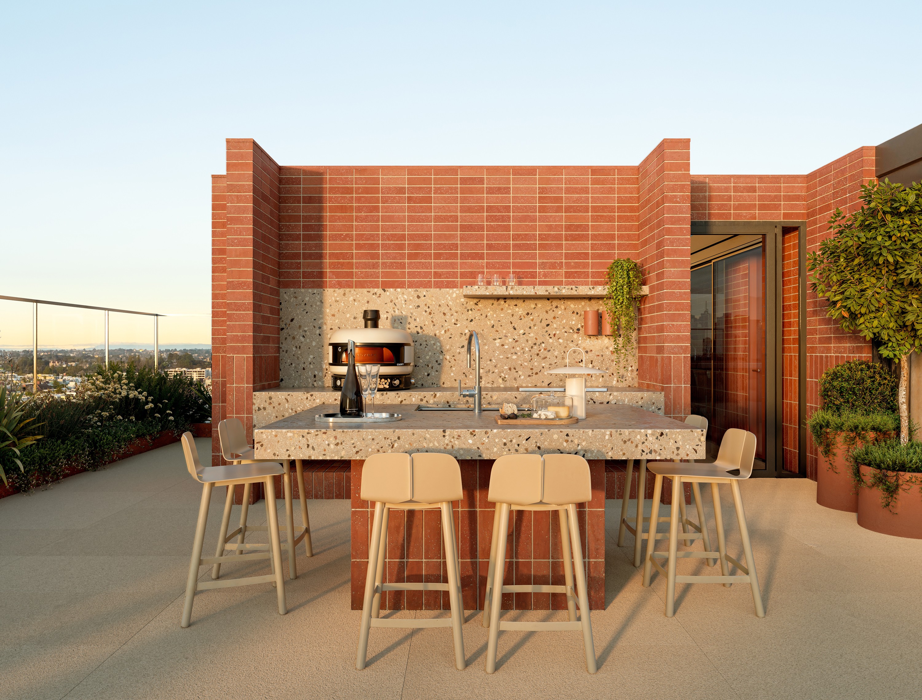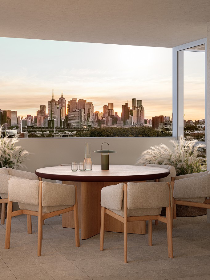 Above, resident-only rooftop sanctuaries curated by Acre crown each building, offering private dining rooms and elevated entertaining spaces set against panoramic views of Melbourne’s skyline. Designed for intimate dinners, discreet gatherings or moments of calm, these lush retreats strike a rare balance between exclusivity and connection.